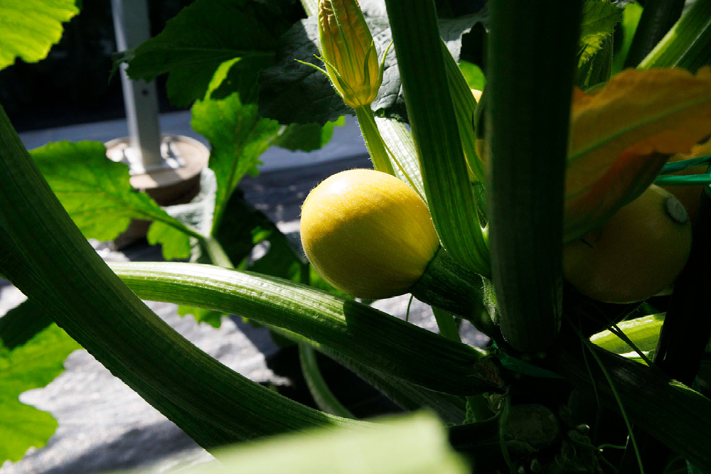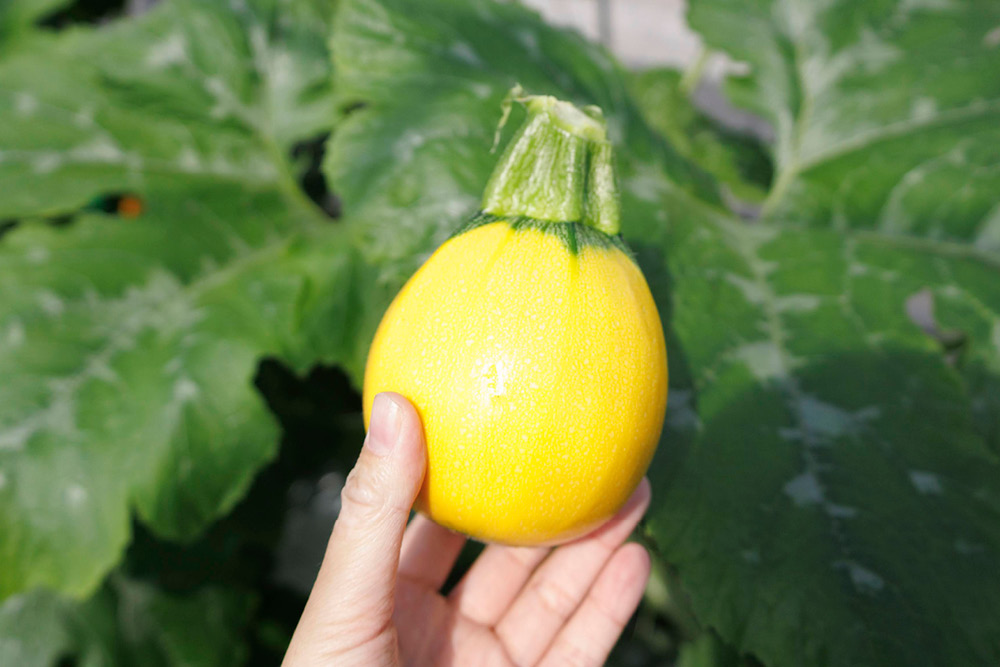 かわいい丸形のズッキーニ、果実色は鮮明な黄色。