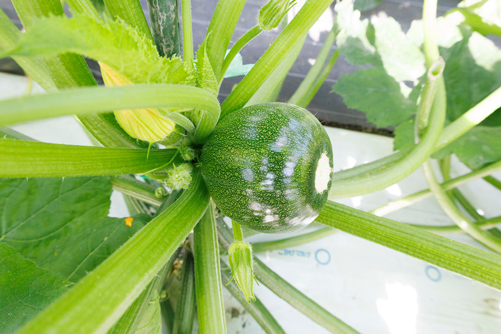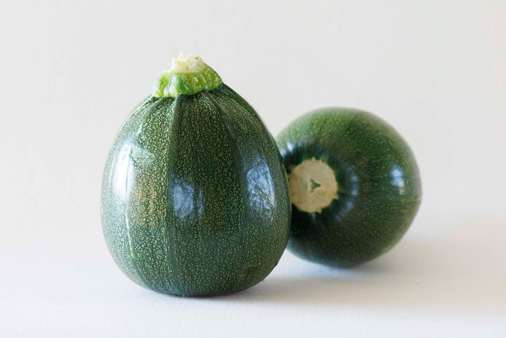 かわいい丸形のズッキーニ、果実色は濃緑色で光沢がある。